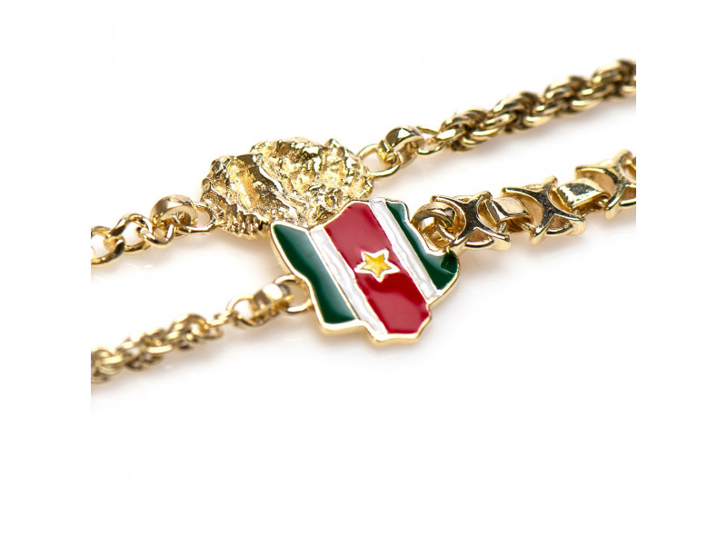 Deze vergulde Surinaamse ala kondre ketting met exclusieve Surinaamse vlag erin verwerkt heeft een stijlvol Surinaams design met een goede oog voor de details. Deze Surinaamse ala kondre ketting heeft een culturele betekenis.